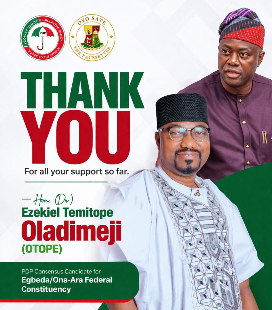 Hon. (Dr.) Ezekiel Temitope Oladimeji, widely known as OTOPE, has extended his profound appreciation to the Executive Governor of Oyo State, His Excellency Engr. Seyi Makinde, and the entire leadership structure of the Peoples Democratic Party (PDP) In Egbeda and Ona Ara Local Government for what he described as a “model of internal democracy and transparency” following his emergence as the consensus candidate for the Egbeda/Ona-Ara Federal Constituency.