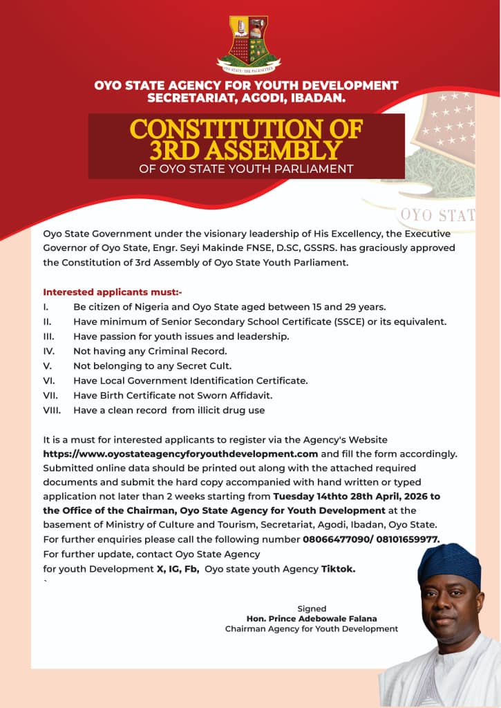 Eligible candidates are to complete registration through the agency’s official website and submit printed copies of their forms with supporting documents to the Office of the Chairman, Oyo State Agency for Youth Development, Secretariat, Agodi, Ibadan, between April 14 and April 28, 2026.