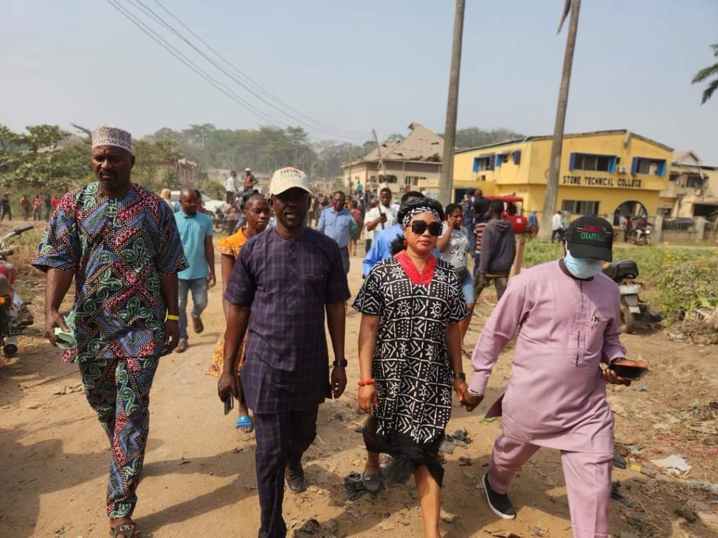 The Chairmanship candidate of the Peoples Democratic Party, PDP in Oluyole ahead of the April Local Government election in Oyo state, Akeem Olatunji and his counterpart from Lagelu Local Government, Hon Kamorudeen Mudashiru, and the Senior Special Assistant on Local Government and Chieftaincy Matters to Governor Seyi Makinde, Honourable Ramata Agberemi Dabo, have visited the scene of the devastated Ibadan explosion.