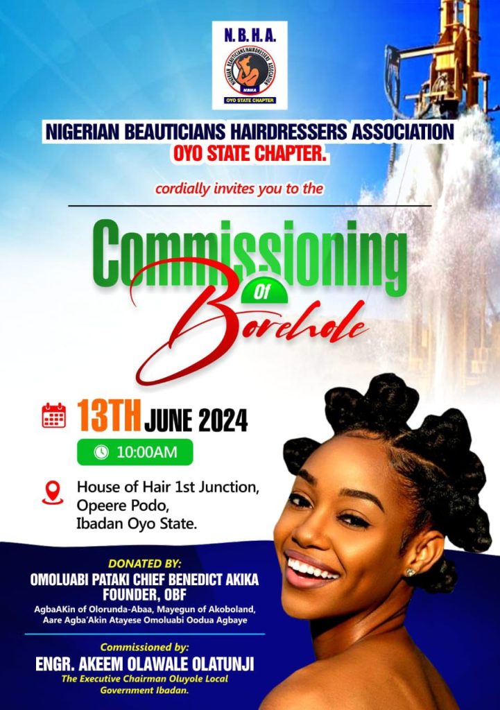 The Executive Chairman of Oluyole Local Government, Engr Akeem Olawale Olatunji will be commissioning Borehole facilitated as part of the Omituntun Development Initiative donated to Nigeria Beauticians / Hairdressers Association (NBHA) Oyo State Chapter, Thursday, June 13 2024.