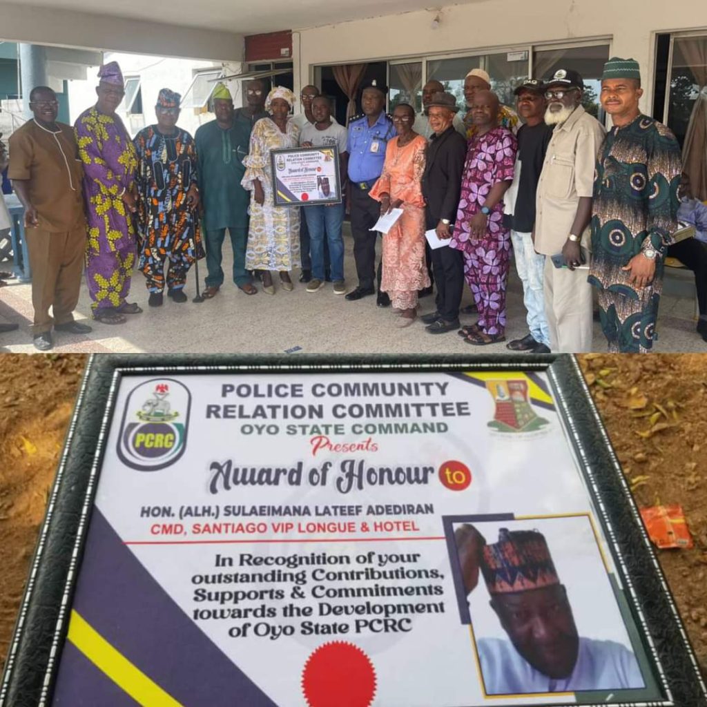 Alhaji Suleimana Abdullateef Adediran, widely recognized as Santana, a distinguished chieftain of the People’s Democratic Party (PDP) in Oyo State and former Executive Chairman of Irepo Local Government Area, has been honored with the prestigious Award of Excellence by the Oyo State Chapter of the Police Community Relations Committee (PCRC).