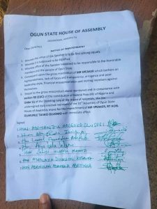 “5. Sequel to the gross misconduct above mentioned and in consonance with section 92 (2)(C) of the constitution of Federal Republic of Nigeria and Order 11 of the Standing rule of the House of Assembly, We the undersigned duly elected members of the 10″ Assembly of Ogun State House of Assembly move for the impeachment of MR SPEAKER, RT HON. OLAKUNLE TAIWO OLUOMO with immediate effect.”