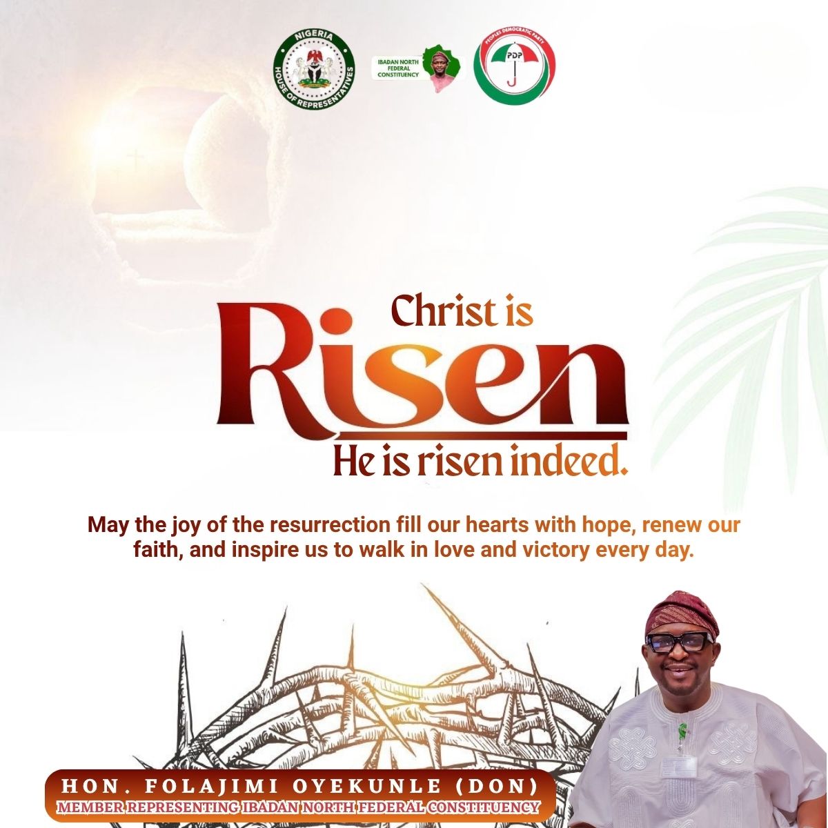 The Lawmaker representing Ibadan North Federal Constituency, Folajimi Oyekunle (DoN), extends warm Easter greetings to Christians across Ibadan North, Nigeria, and the world as they celebrate the joy of Easter.