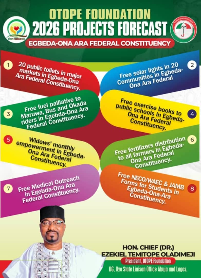The President of OTOPE Foundation, Hon. Dr. Temitope Ezekiel Oladimeji, has announced a comprehensive lineup of humanitarian and development-focused projects scheduled for implementation across Egbeda–Ona Ara Federal Constituency in 2026.