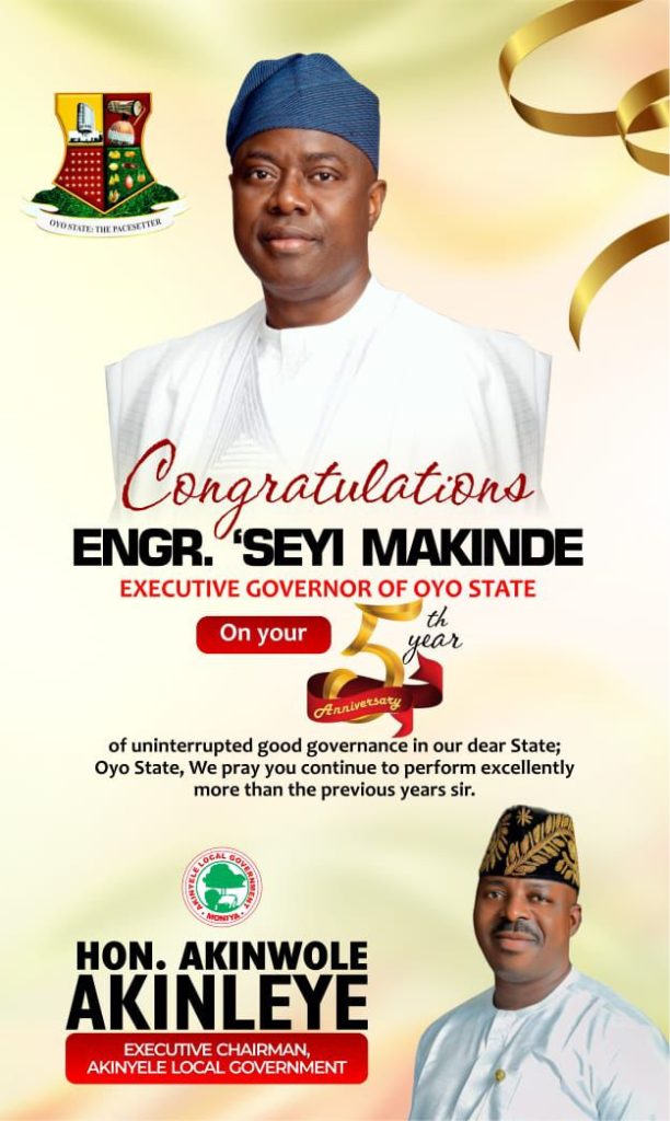 The Executive Chairman of Akinyele Local Government, Hon Akinwole Akinleye extends his congratulatory message to the Executive Governor of Oyo State. HE, Engr Seyi Makinde on his fifth anniversary as the Governor of the State.