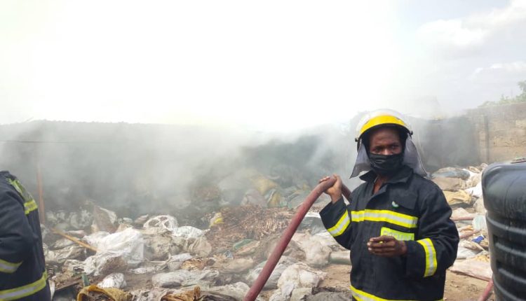 Officials of the Oyo State Fire Service battling a fire that engulfed heaps of local herbs at a storage site in Oyo town on Saturday. Photo: Oyo State Fire Service.