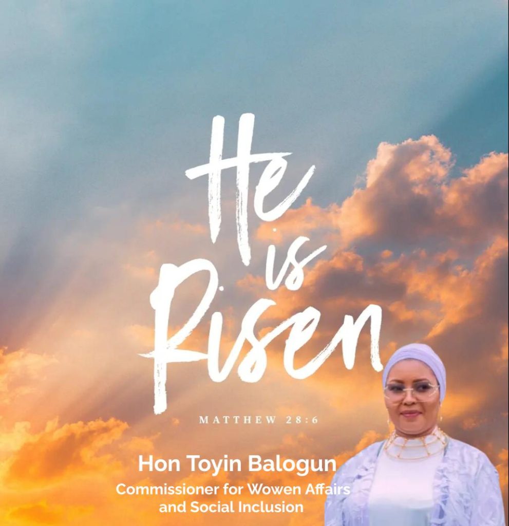 The Honorable Commissioner for Women Affairs & Social Inclusion Hon( Mrs) Toyin Balogun joyously wishes our people the best Easter celebration ever
