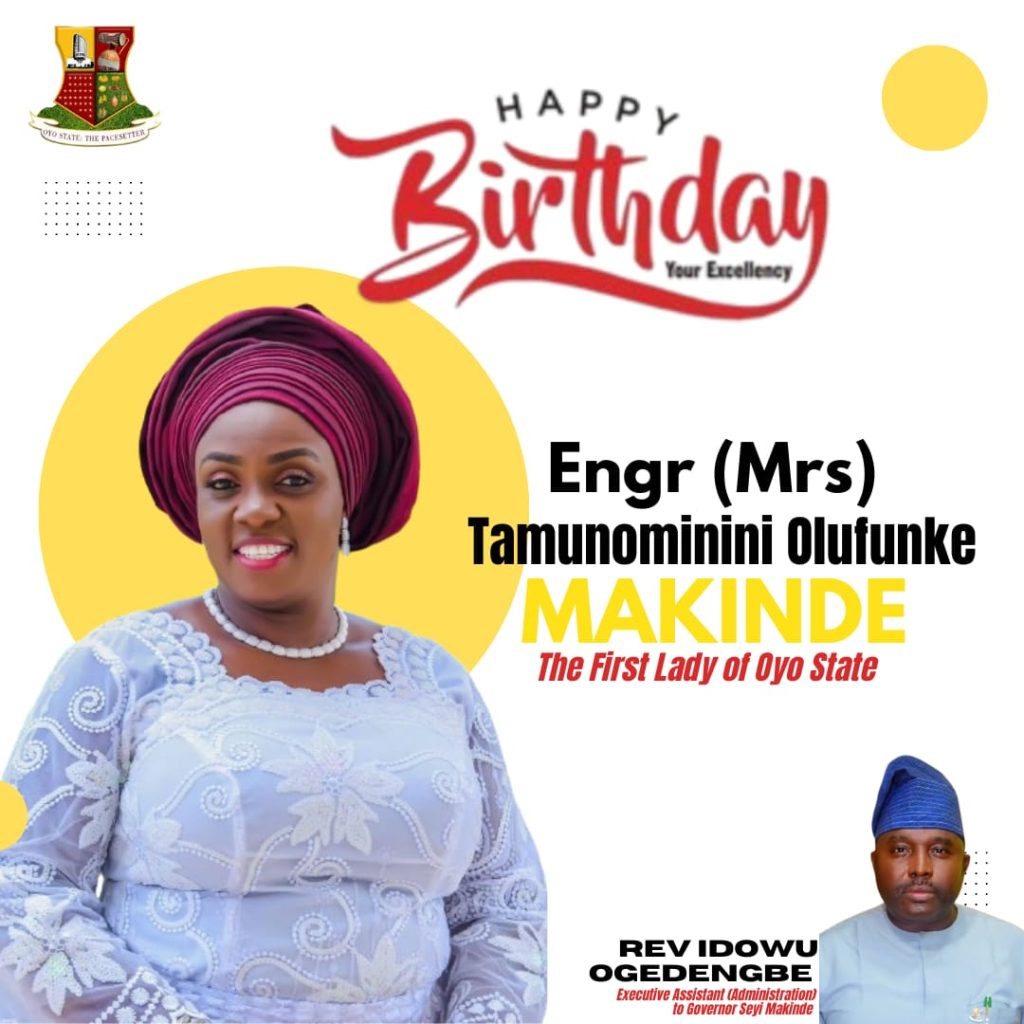 The Executive Assistant to Governor Seyi Makinde on Administration, Rev Idowu Ogedengbe has felicitated the first lady and wife of the Executive Governor of Oyo State, Engr (Mrs) Tamunominini Olufunke Makinde on the occasion of her 52nd birthday anniversary.