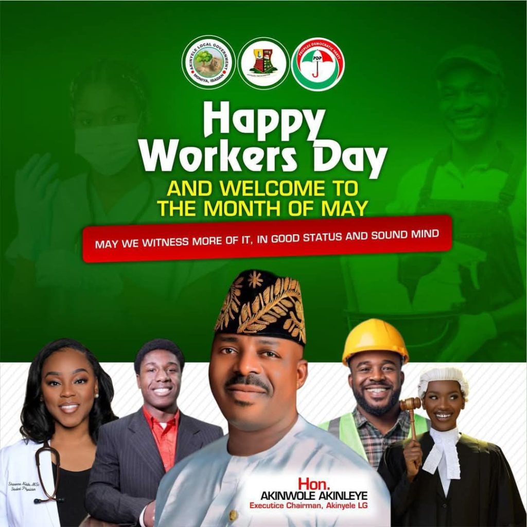 Hon. Akinwole Akinleye’s New month and workers day celebration message is a beacon of hope for the residents of Akinyele LG and a source of Encouragement to Akinyele Workers. By promoting values of hard work, integrity, and community support, he aims to inspire a collective effort towards a prosperous future.