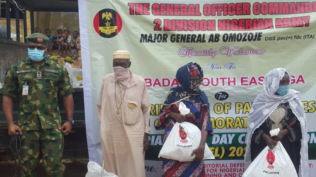 The release further stated that “The Chief of Army Staff, Lieutenant General Tukur Yusufu Buratai, ably represented by the General Officer Commanding 2 Division Nigerian Army, Maj. Gen. AB Omozoje today, 4 July 2020, distributed palliatives in commemoration of Nigerian Army Day Celebration (NADCEL)2020 to the residents of Idi Arere and Ode Aje in Ibadan South East LGA of Oyo State.