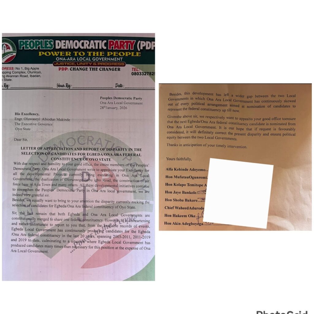 Leaders of the Peoples Democratic Party (PDP) in Ona-Ara Local Government Area of Oyo State have written to Governor Seyi Makinde, commending his administration for ongoing developmental projects in the area, while calling for an end to what they described as a 20-year dominance by Egbeda Local Government in the Egbeda/Ona-Ara Federal Constituency ticket.
