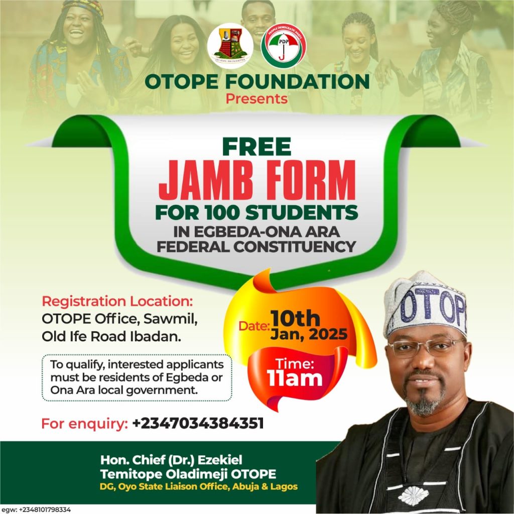 In a move aimed at promoting education and supporting students in his constituency, The OTOPE Foundation, under the auspices of Hon. Chief (Dr.) Ezekiel Temitope Oladimeji, is pleased to announce the commencement of a free JAMB registration program for 100 deserving students from Egbeda and Ona-Ara Local Governments.