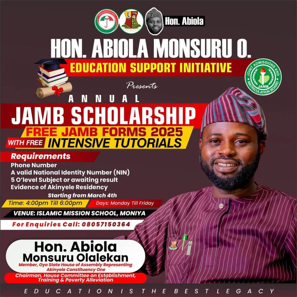Hon. Abiola Monsuru Olalekan, Oyo State House of Assembly Member representing Akinyele Constituency One who doubled as the Chairman House Committee on Establishment, Training and Poverty Alleviation is proud to announce the launch of his initiative to provide free Joint Admission and Matriculation Board (JAMB) forms and conduct free tutorial sessions for students in the community.