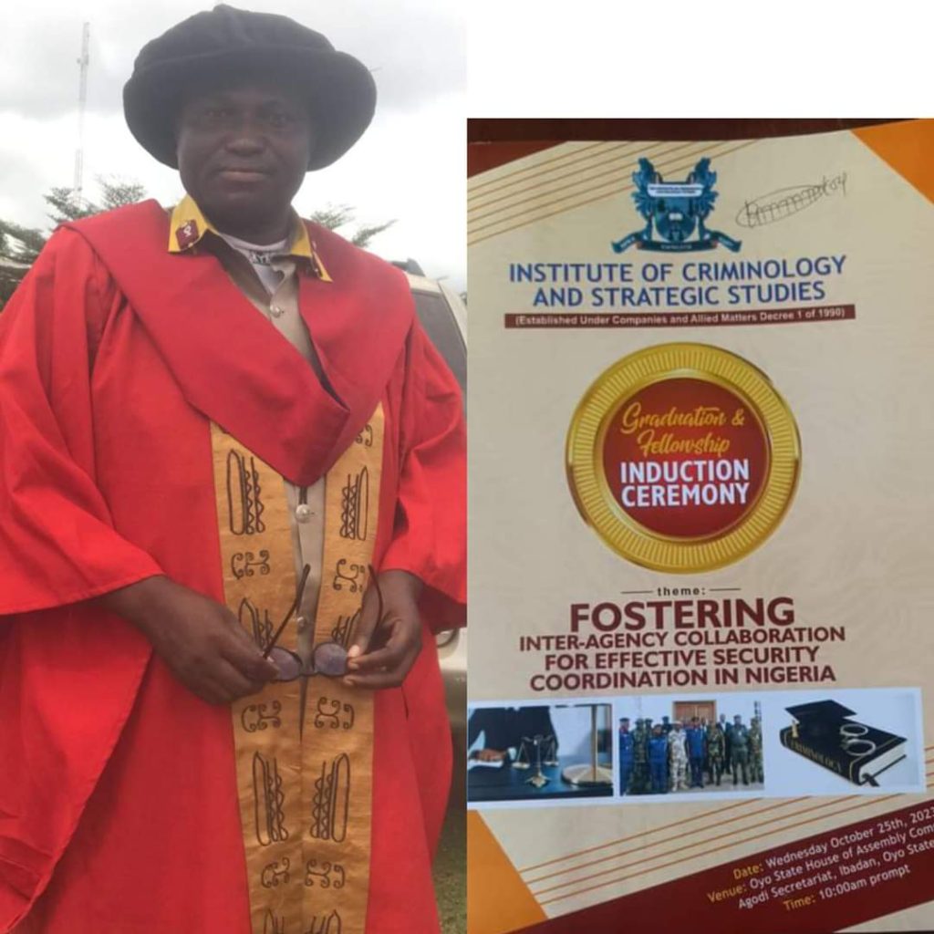The General Manager of Oyo State Road Traffic Management Authority, OYRTMA , Ayoade Adeoye on Wednesday, bagged the Fellowship of the Institute of Criminology and Strategic Studies (ICSS).
