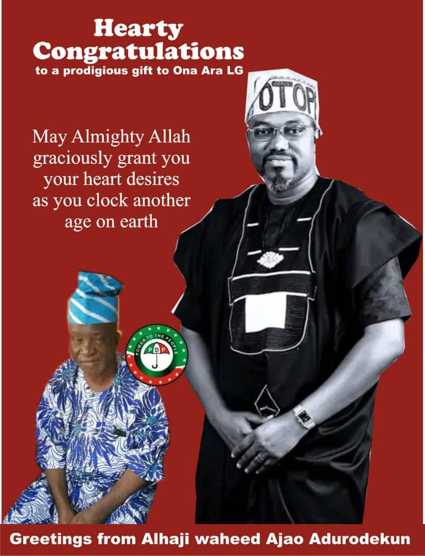It is with great delight that I join PDP members in Ona-Ara LG in celebrating a true patriot, Dr. Ezekiel Temitope Oladimeji (OTOPE), as he marks another year of life today. OTOPE is a remarkable asset to our local government, known for his dedication and service to humanity.