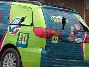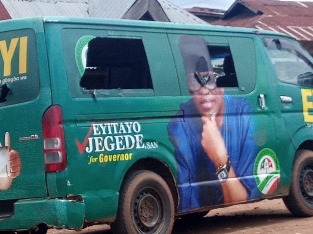 The Peoples Democratic Party (PDP) candidate in the forthcoming gubernatorial election in Ondo State, Eyitayo Jegede, was on Wednesday attacked at Oba Akoko, with 10 of his campaign vehicles brutally vandalised.