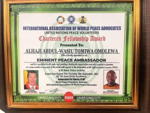 Earlier today, I was nominated and awarded Eminent Peace Ambassador by the International Association of World Peace Advocates (United Nations Peace Volunteers) at Jogor Center, Ibadan.