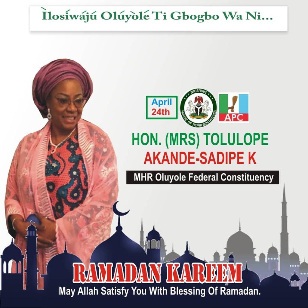 The lawmaker representing Oluyole Federal Constituency and the Chairperson House of Representative Committee on Diaspora Hon. Tolulope Akande-Sadipe K has advised Muslims to give and practise charity during this pandemic. She urges them to follow rules and regulations that govern this Holy Month and pray for the country during this hard time.