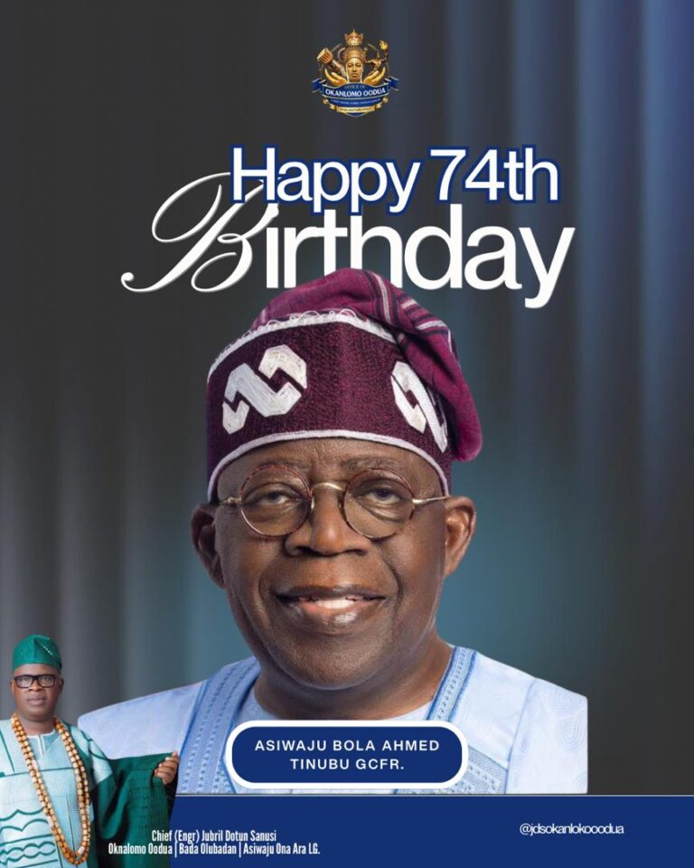 The Okanlomo Oodua and Bada Olubadan of Ibadanland, Chief Jubril Dotun Sanusi, has extended warm congratulations to President and Commander-in-Chief of the Armed Forces of the Federal Republic of Nigeria, Asiwaju Bola Ahmed Tinubu, GCFR, on the occasion of his 74th birthday, describing him as the undisputed pillar of progressive politics and a defining force in Nigeria’s democratic journey.