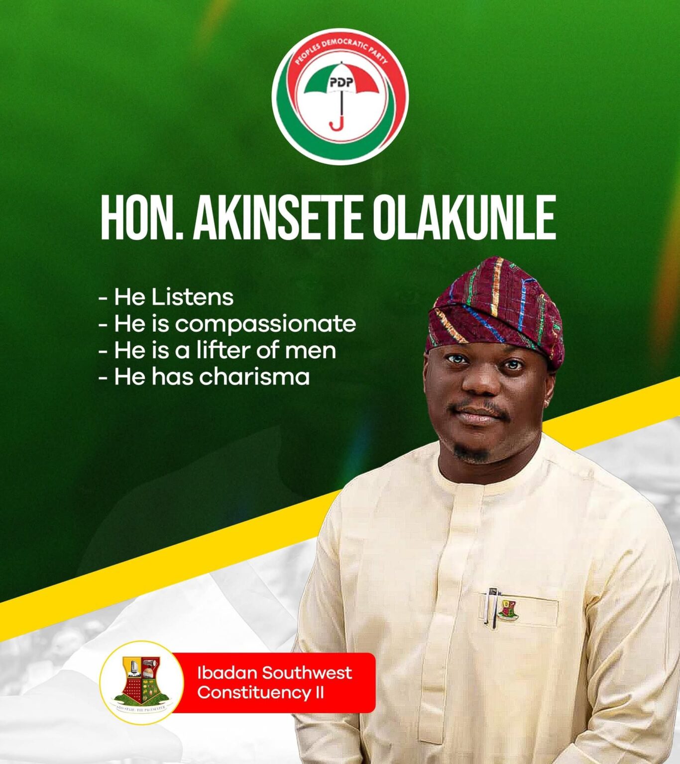 With his deep understanding of grassroots realities, strong interpersonal relationships, and passion for public service, Akinsete possesses the qualities required to effectively advocate for Ibadan South-West State Constituency II.