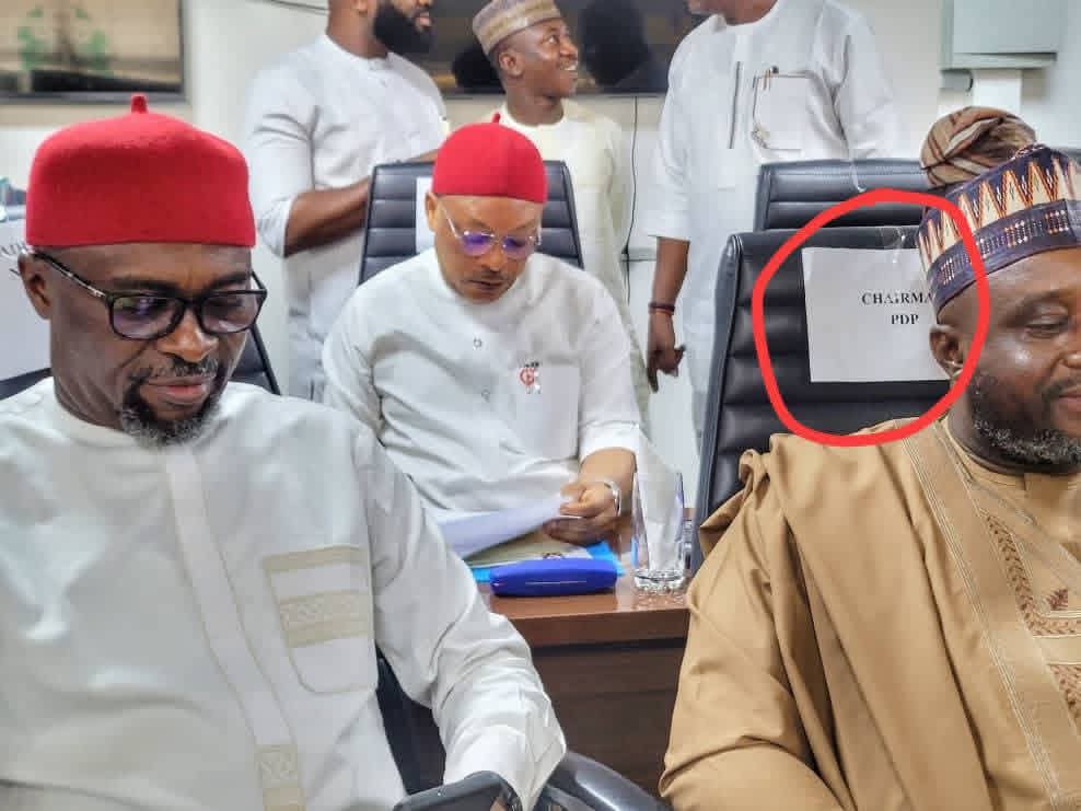 The acting chairman occupied a front-row seat designated “PDP Chairman,” while Anyanwu sat behind him on a seat labelled “PDP National Secretary.”