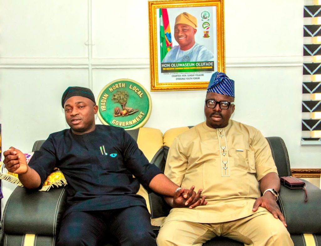 The Executive Chairman of Akinyele Local Government, Hon Wole Akinleye felicitates with the Executive Chairman of Ibadan North Local Government, Hon Seun Olufade on the Auspicious celebration of his birthday.